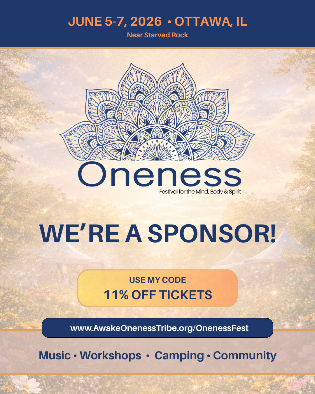 [Sponsor Name] is proud to be a sponsor of the AWAKE: Oneness Festival — a beautiful camping festival focused on music, healing, workshops, and conscious community. 🌿🎶