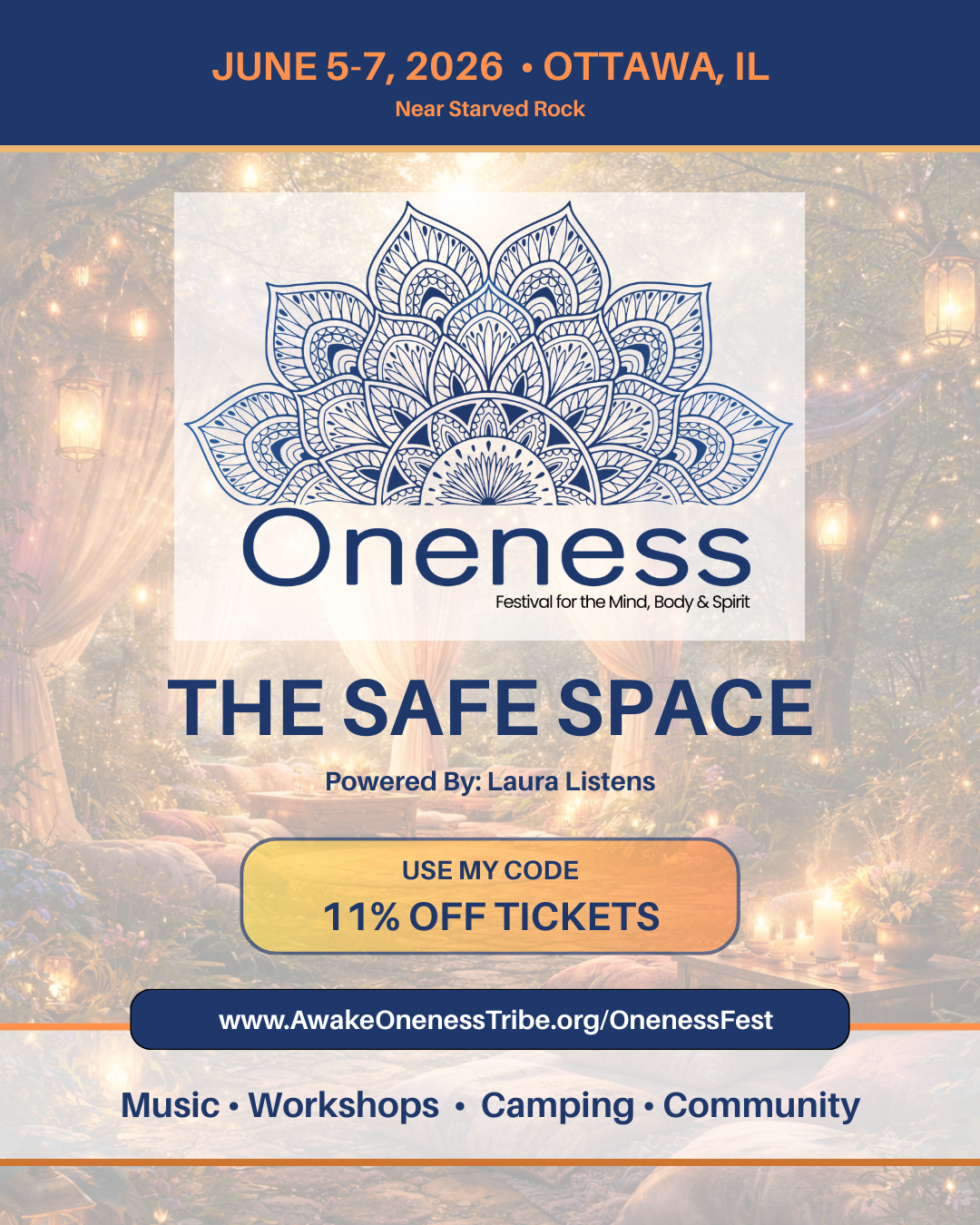 #OnenessFest, #AwakeOnenessTribe, #SafeSpace, #LauraListens, #ConsciousCommunity, #FestivalCare